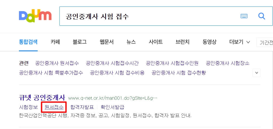1. 다음 검색창에 "공인중개사 시험접수" 검색을 합니다.