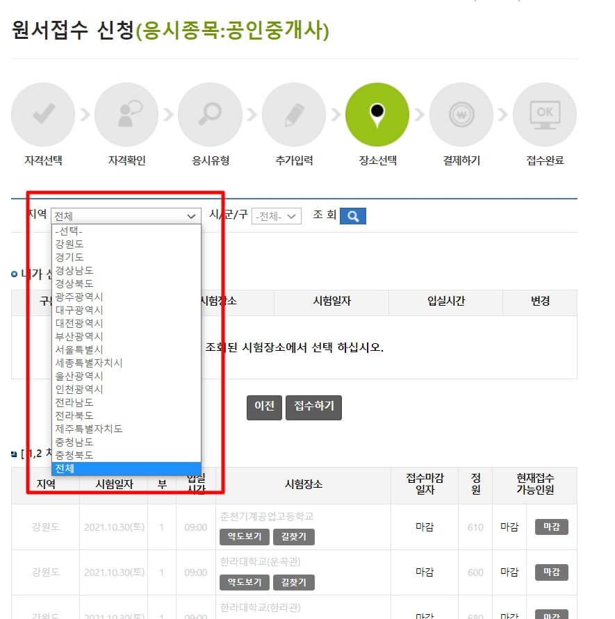 12. 지역을 선택하시고 조회를 하시면 현재 접수 가능인원이 나오고, 그 외는 마감이라고 나옵니다. 빠르게 접수를 하셔야 본인이 원하는 지역에 접수를 하실 수 있습니다.