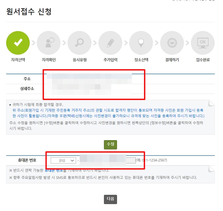 6. 주소, 상세주소, 휴대폰 번호를 입력하고 다음을 누릅니다.