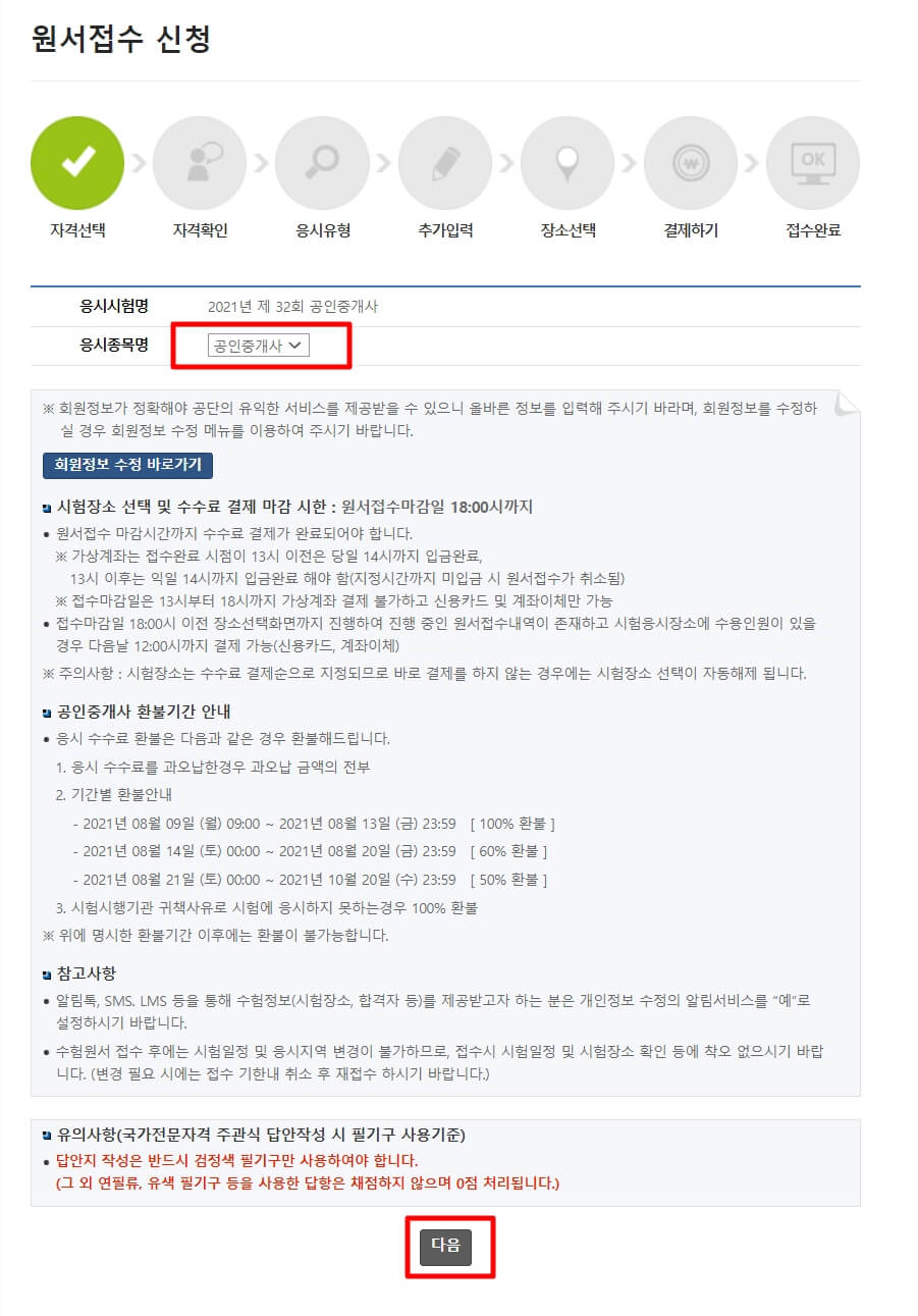 7. 응시 종목명을" 공인중개사"로 하고 아래의 주의사항을 확인한 후, 다음을 누릅니다.
