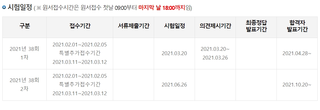 21년 38회 1회, 2회 시험 일정은 다음과 같습니다.