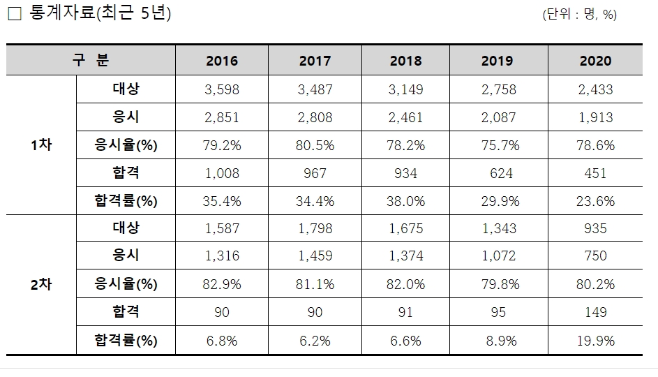 관세사 시험 최근 5년간 응시인원 및 합격자 인원, 합격률입니다.