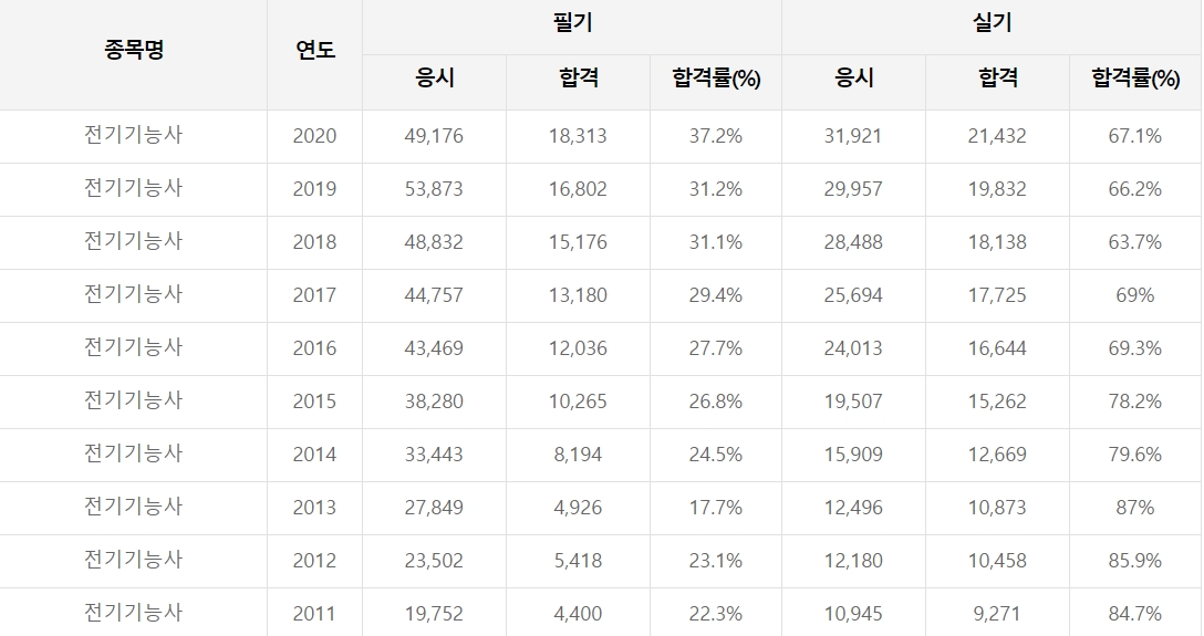 전기기능사 시험 최근 10년간 응시인원 및 합격자 인원, 합격률입니다.
