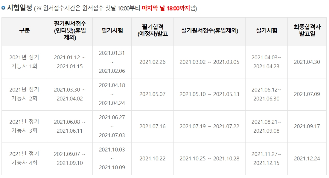21년 정기 기능사 1회, 2회, 3회, 4회 시험일정은 다음과 같습니다.