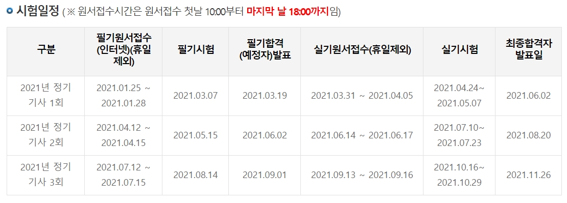 21년 정기 기사 1회, 2회, 3회 시험 일정은 다음과 같습니다.