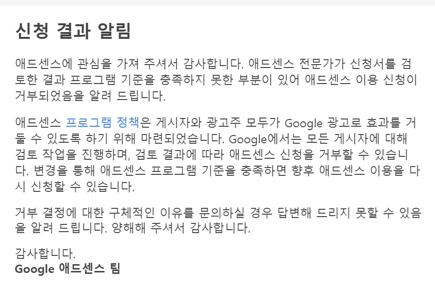 글 11개 쓰고 애드센스 첫 번째 신청을 하였습니다. 신청을 하니 빠르면 며칠 내, 최대 2주 안에 결과 통보를 하여준다는 메일을 받았습니다. 이렇게 신청을 하고 나서는 진짜 꾸준하게 글을 쓴거 같습니다. 첫 번째 결과가 딱 2주간 지난 3. 13일경에 메일이 왔어요. 당연히 승인거절 메일이었어요. 기대도 하지 않아서 실망도 별로 없었습니다.