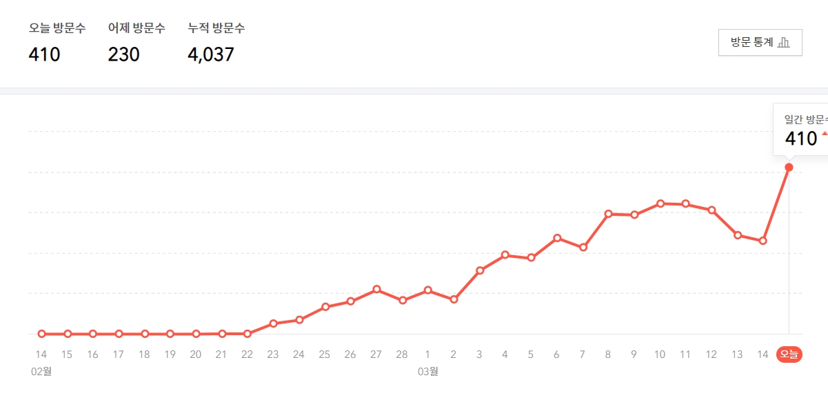 4) 그리고 방문자 수도 중요한 것으로 생각하는데요. 최적화되면은 방문자수가 늘어나시는 것을 느낄 수 있습니다. 최적화는 어느 정도 시간이 지나야 될 수 있습니다. 최적화 방법은 검색하시면 알 수 있습니다. 저 같은 경우는 방문자수가 2. 23일까지는 거의 들어오지 않았습니다. 그러다 2. 25일쯤 최적화가 되어 하루 몇십 명에서 100명을 넣고 200명대를 유지하다, 지금은 300~400명 정도 들어오고 있습니다.
