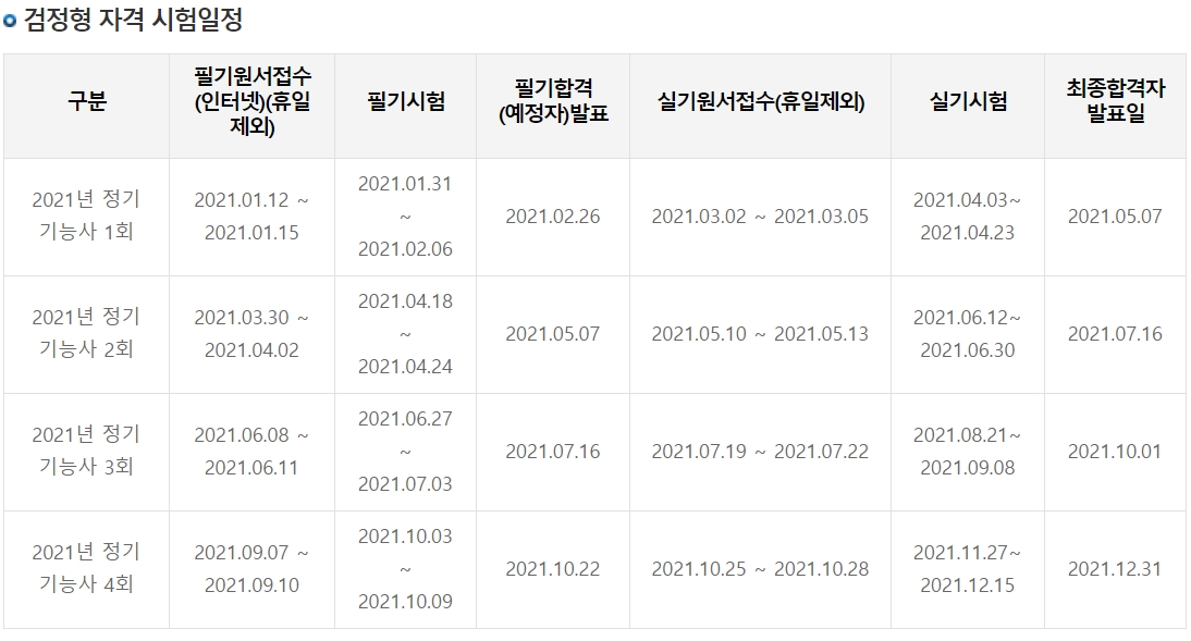 21년 정기 기능사 1회, 2회, 3회, 4회 시험 일정은 다음과 같습니다.