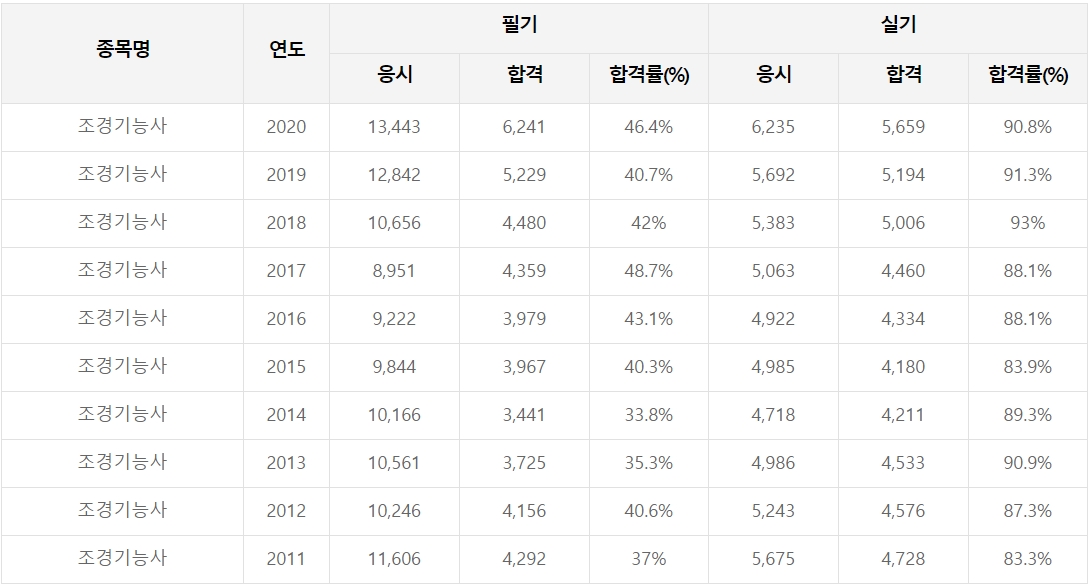 조경기능사 시험 최근 10년간 응시인원 및 합격자 인원, 합격률입니다.