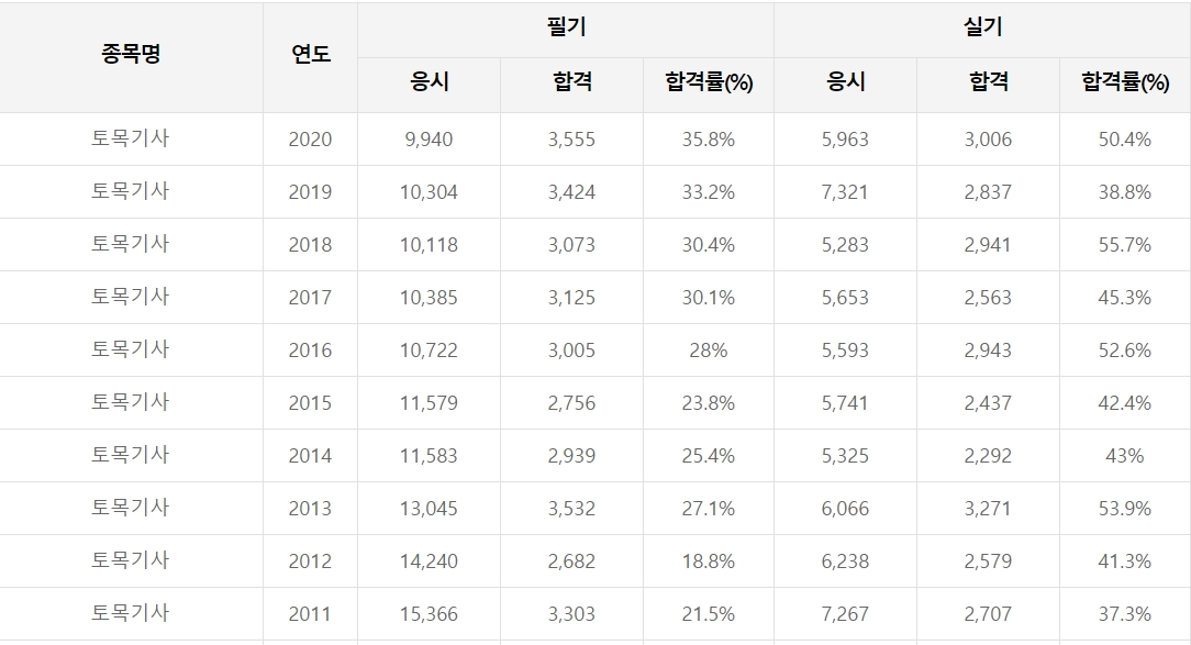 토목기사 시험 최근 10년간 응시인원 및 합격자 인원, 합격률입니다.