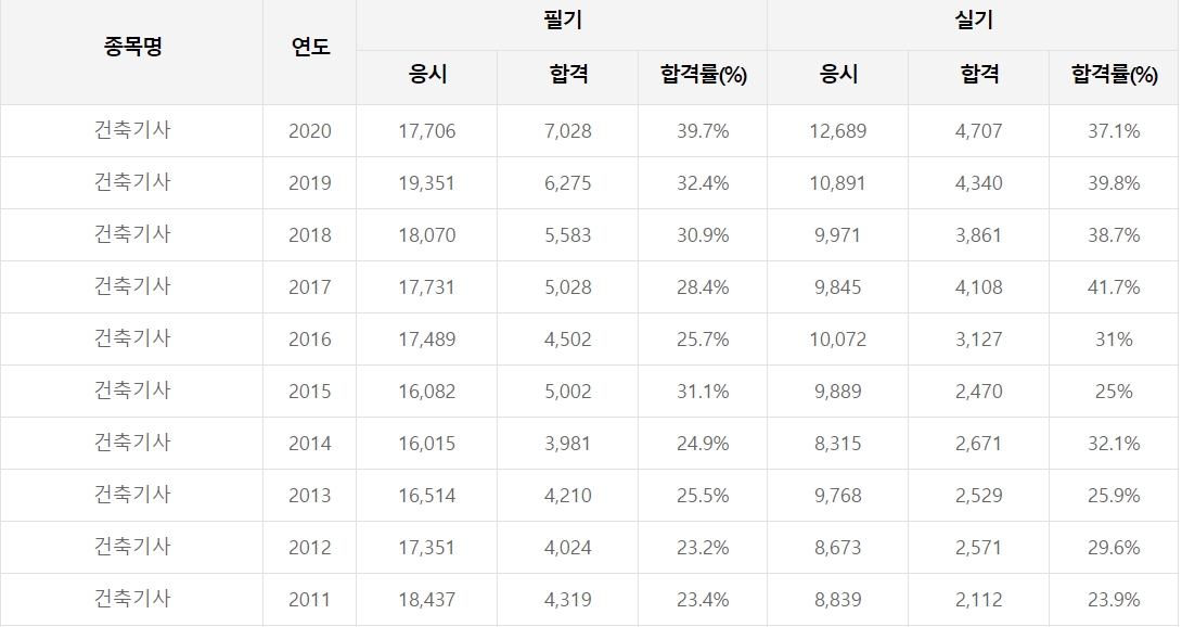 건축기사 시험 최근 10년간 응시인원 및 합격자 인원, 합격률입니다.