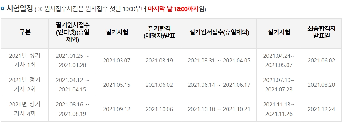 21년 정기 기사 1회 2회 3회 시험일정은 다음과 같습니다.