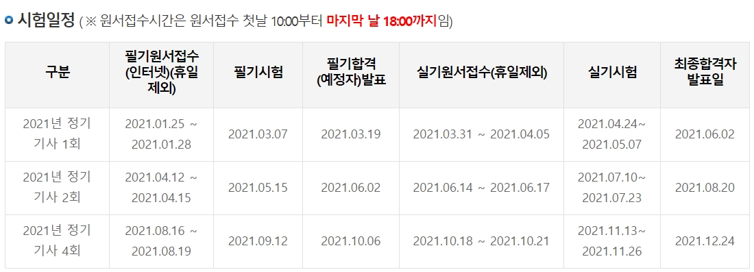 21년 정기 기사 1회, 2회, 3회 시험일정은 다음과 같습니다.