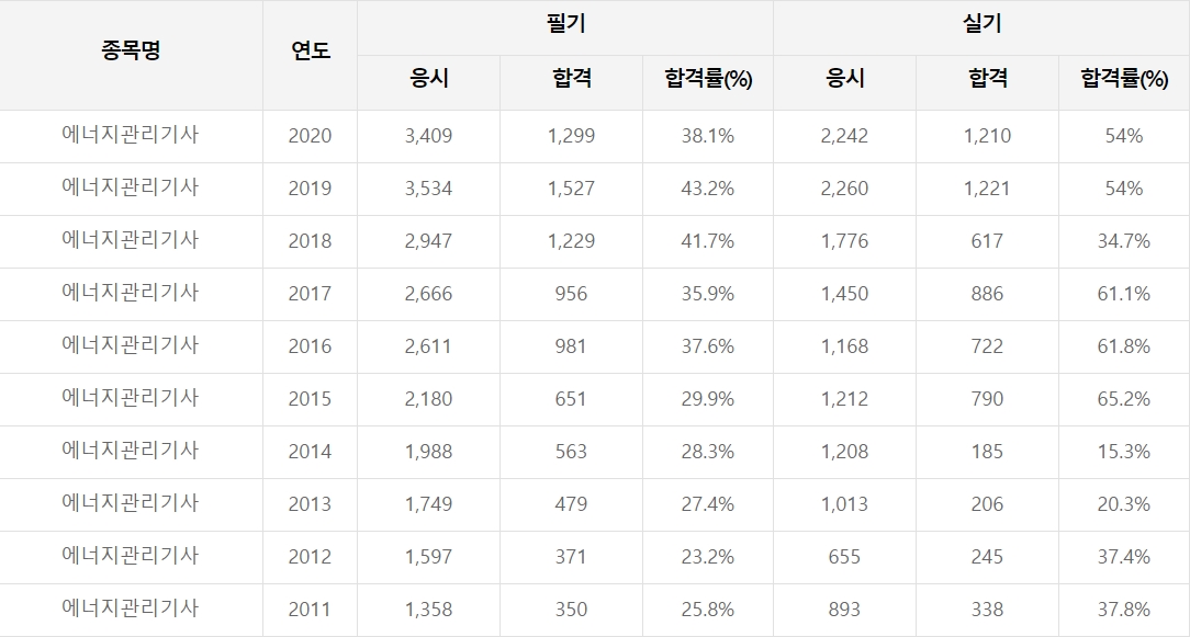 에너지관리기사 시험 최근 10년간 응시인원 및 합격자 인원, 합격률입니다.