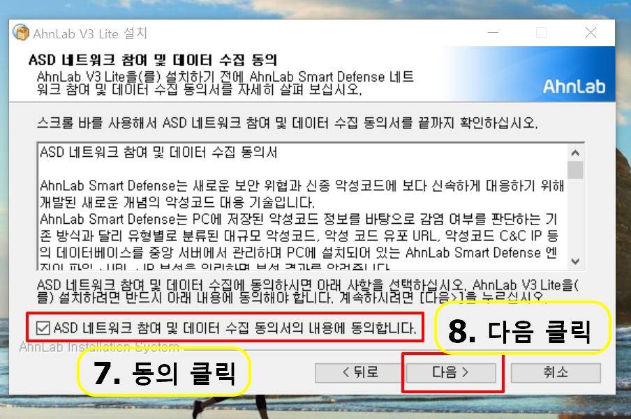 5. "ASD 네트워크 참여 및 데이터 수집 동의서의 내용에 동의합니다" 클릭, "다음" 클릭합니다.