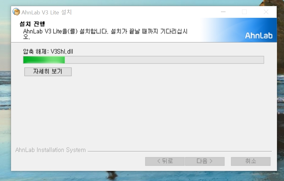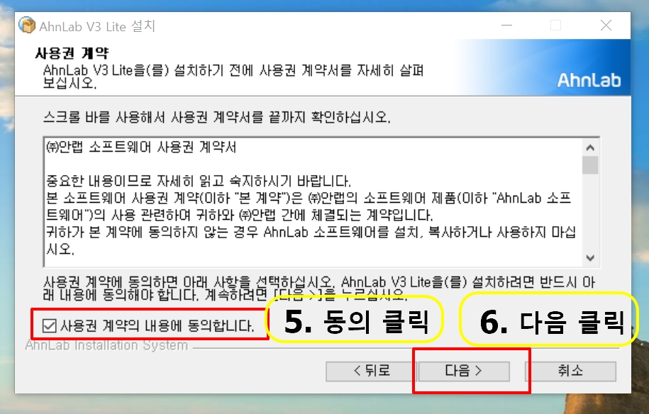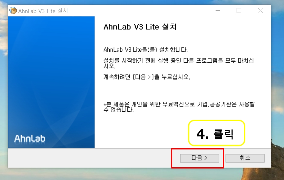 3. 안랩 V3 Lite 설치가 뜨면 "다음" 을 클릭합니다.