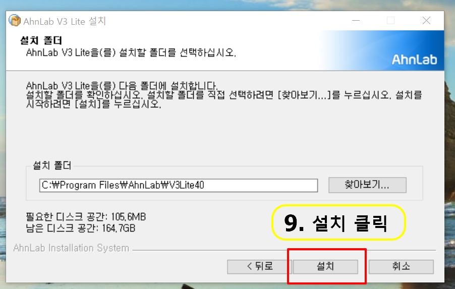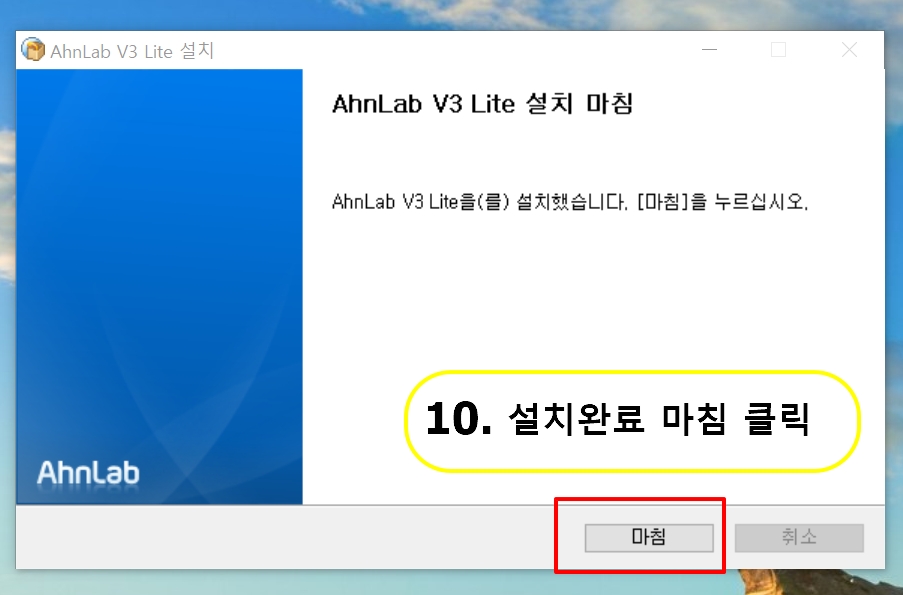 8. 안랩 V3 Lite 설치 마침이 뜨면 "마침"을 클릭합니다.