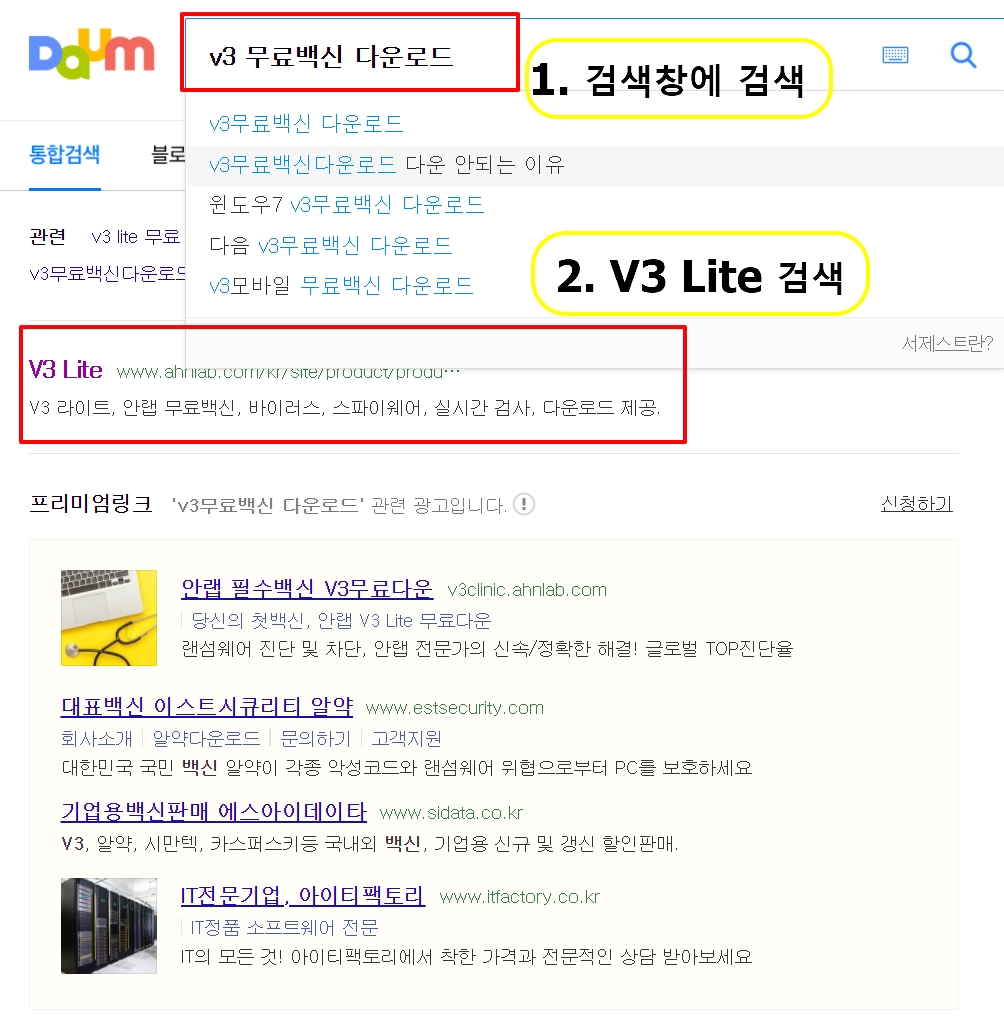 1. 다음(daum) 검색창에 "V3 무료백신 다운로드" 로 검색하신 후, "V3 Lite" 검색합니다.