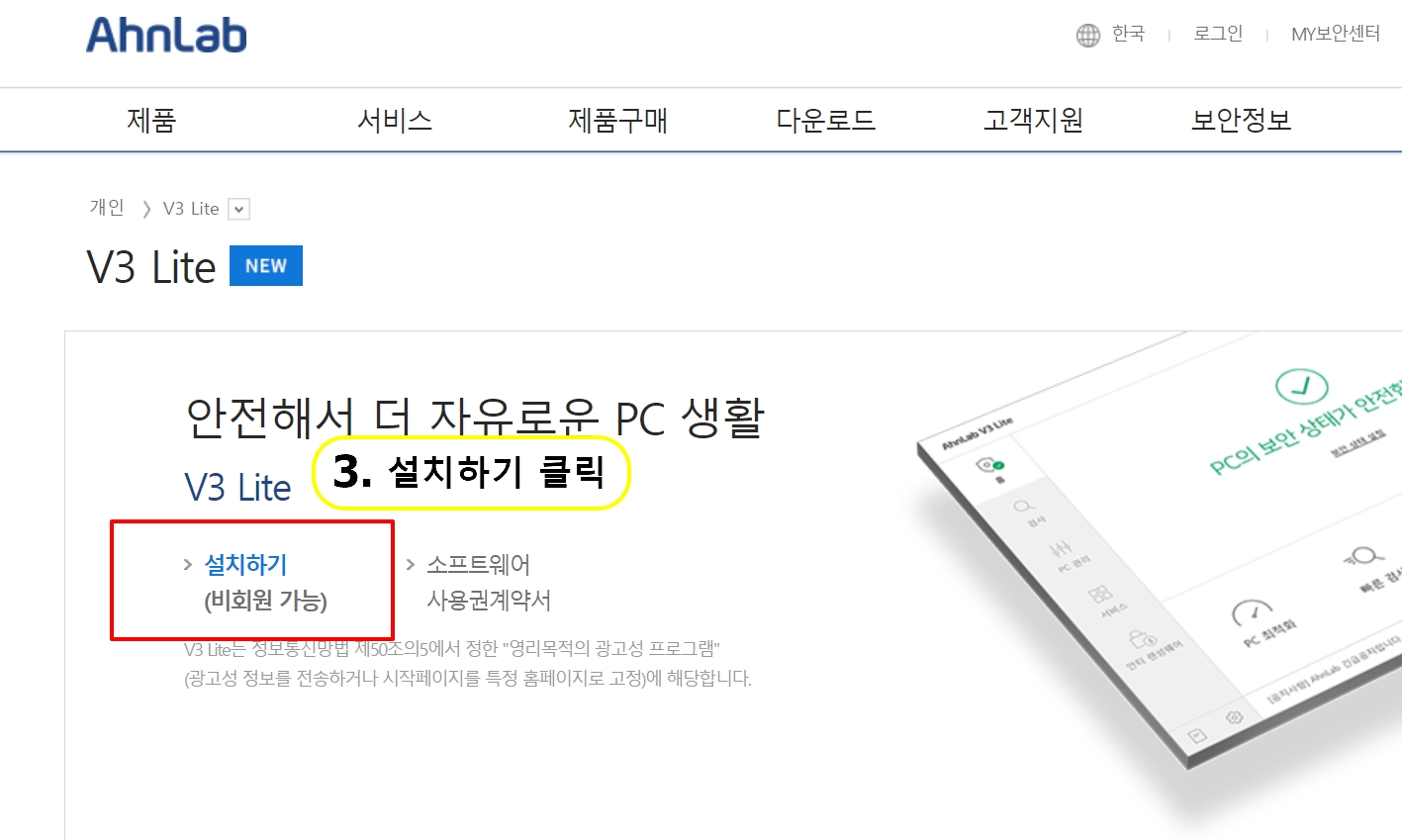 2. 안랩 홈페이지 "설치하기(비회원 가능)" 를 클릭합니다.