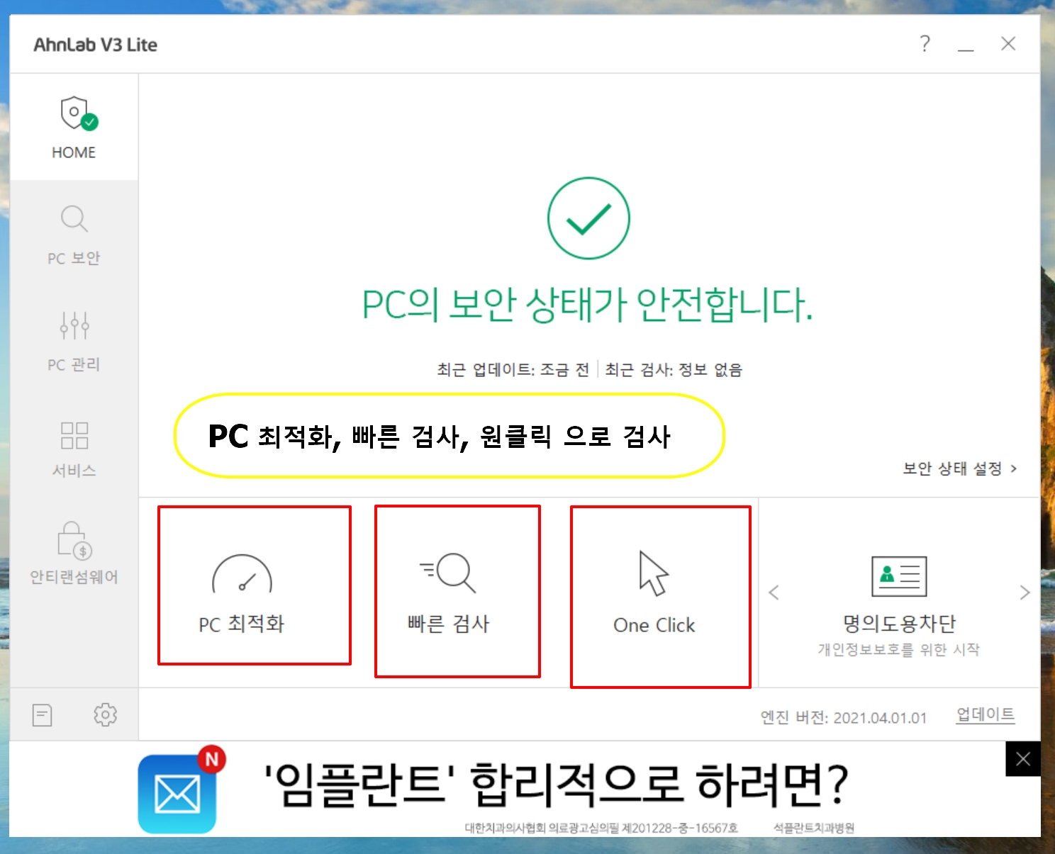 9. 안랩 V3 Lite 를 실행하시면 PC최적화, 빠른 검사, one click 등 PC의 보안상태를 안전하게 유지할수 있습니다.