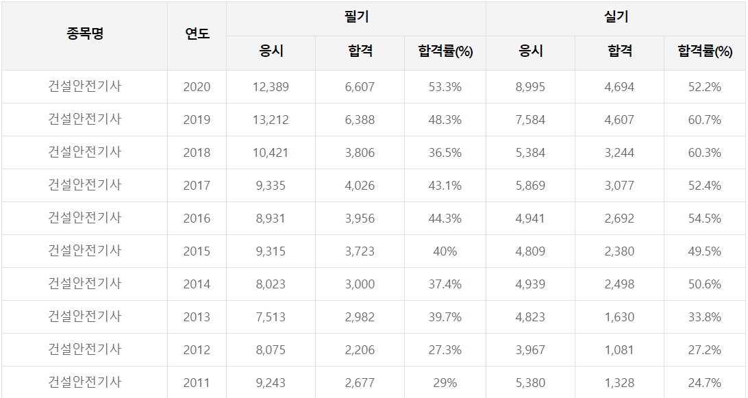 건설안전기사 시험 최근 10년간 응시인원 및 합격자 인원, 합격률입니다.