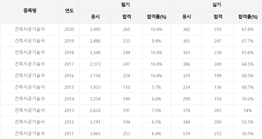 건축시공기술사 시험 최근 10년간 응시인원 및 합격자 인원, 합격률입니다.